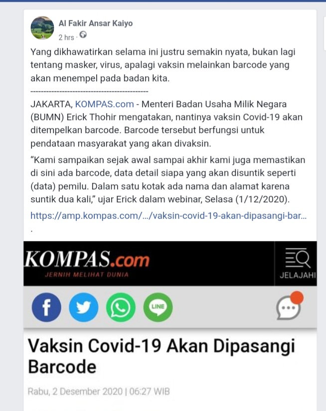KabarMedan.com | Lagi-lagi, beredar postingan dari akun Facebook Al Fakir Ansar Kaiyo https://archive.vn/IekI2 berupa sebuah tangkapan layar dengan kutipan narasi dari kompas.com berserta klaim bahwa adanya pemasangan barcode pada badan manusia. Postingan ini diposting pada 2 Desember 2020.