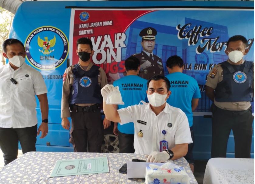 LUBUKPAKAM, KabarMedan.com | Badan Narkotika Nasional Kabupaten (BNNK) Deli Serdang berhasil menangkap 2 orang tersangka yang diduga sindikat peredaran narkoba antar provinsi jenis sabu dengan barang bukti 100 gram.