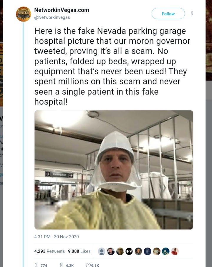 “Ini adalah gambar rumah sakit garasi parkir Nevada palsu yang di-tweet oleh gubernur bodoh kita, membuktikan bahwa itu semua scam. Tidak ada pasien, tempat tidur terlipat, peralatan dibungkus yang tidak pernah digunakan! Mereka menghabiskan jutaan dolar untuk penipuan ini dan tidak pernah melihat satu pasien pun di rumah sakit palsu ini!”