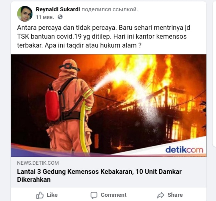 KabarMedan.com | Akun Reynaldi Sukardi (fb.com/reynaldi.sukardi) membagikan tautan artikel berita dari situs Detikcom yang berjudul “Lantai 3 Gedung Kemensos Kebakaran, 10 Unit Damkar Dikerahkan”.