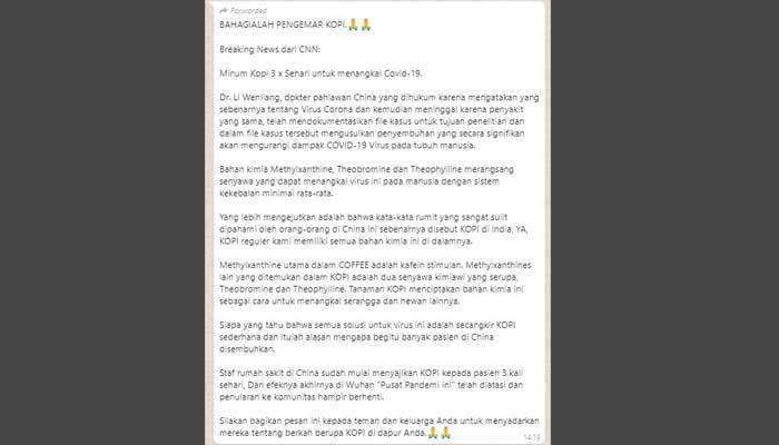 Dalam pesan yang beredar itu, diklaim berasal dari hasil penelitian seorang dokter asal China bernama Dr. Li Wenliang dan telah diterbitkan oleh media mainstream CNN.