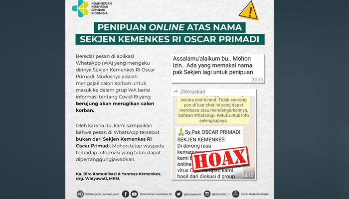 Kemenkes juga mengimbau kepada masyarakat untuk mengabaikan apabila menerima pasan untuk bergabung dalam WhatsApp grup terkait Covid-19 maupun pesan-pesan lainnya yang mengatasnamakan Sekjen Kemenkes Oscar Primadi. [Tim Fact Checker]