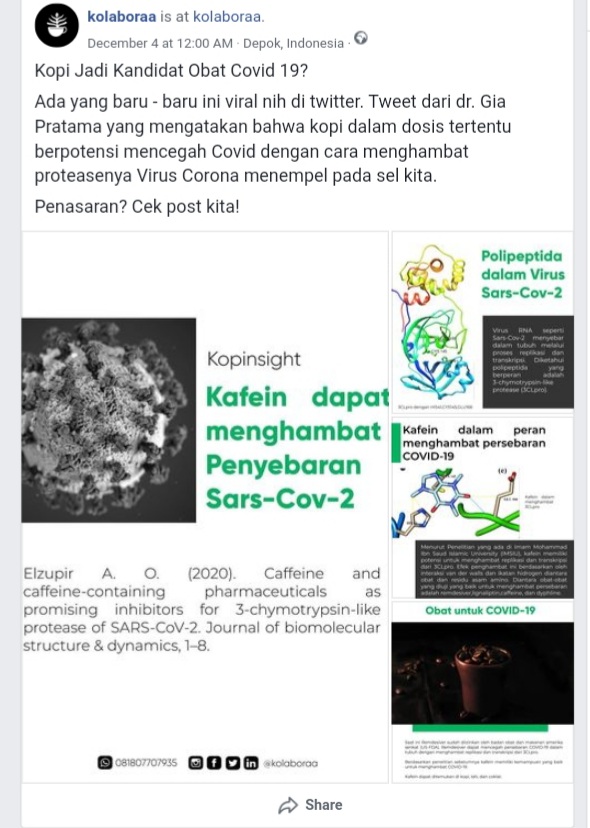 KabarMedan.com | Akun Facebook Kolaboraa mengunggah sebuah postingan yang berisi klaim soal kopi yang bisa mencegah Covid-19, postingan tersebut diunggah pada Jumat (04/12/2020).