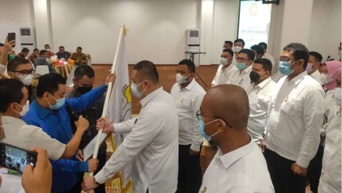 MEDAN, KabarMedan.com | Badan Pengurus Cabang (BPC) Himpunan Pengusaha Muda Indonesia (HIPMI) Kota Medan mengukuhkan kepengurusan barunya untuk masa bakti 2020-2023, di ballroom Focal Point Medan, Rabu (27/1/2021).