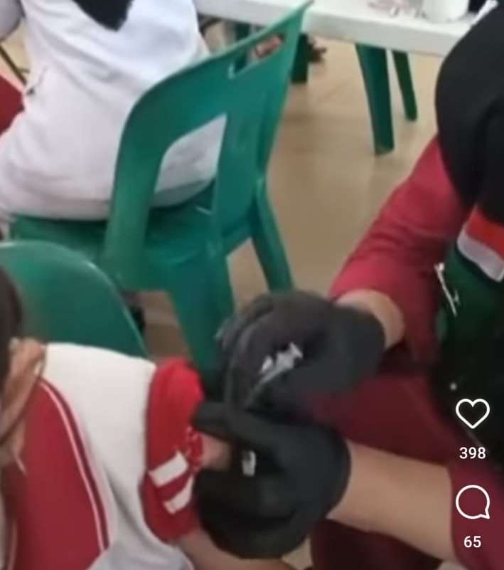 “Lalu menyuntikkan vaksin secara intramuskular di daerah lengan kiri atas menggunakan spuit yang diambil dan menyuntikkannya,” ucapnya.
