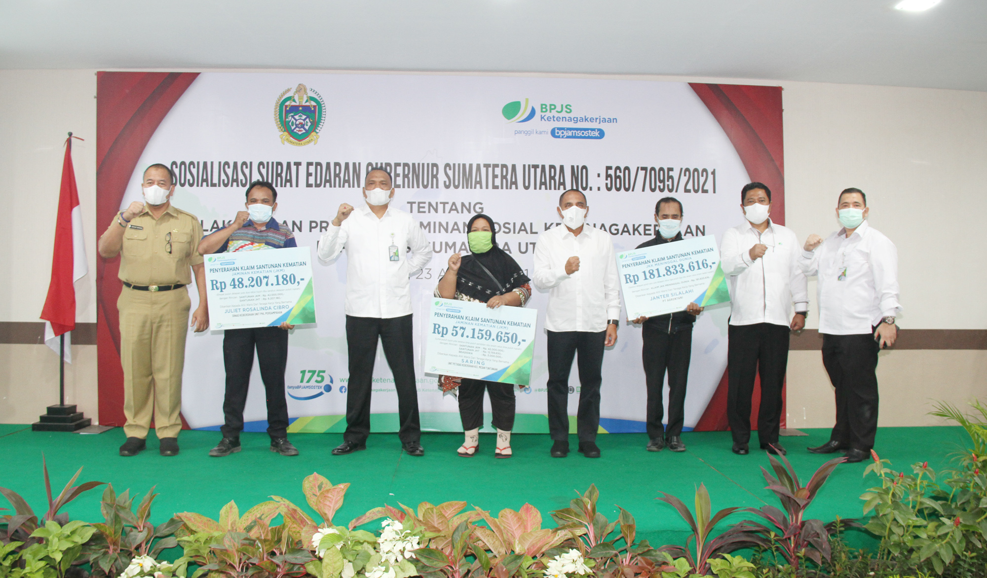 Pada kesempatan itu, Gubernur Edy Rahmayadi juga menyerahkan klaim Jaminan Kematian (JKm) secara simbolis antara lain atas nama Juliet Rosalinda Cibro yang bertugas di Dinas Kebersihan Unit PHL Persampahan yang menerima uang tunai sebesar Rp48.207.180.