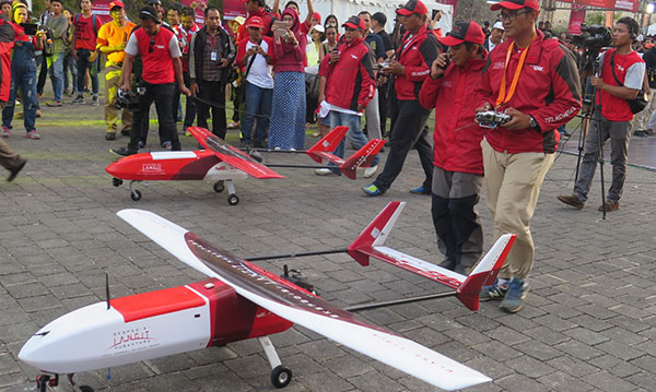 Dua buah drone berukuran besar, Elang Barat dan Elang Timur mengakhiri Ekspedisi Langit Nusantara (Elang Nusa) Telkomsel di Garuda Wisnu Kencana, Bali (14/5/2016).