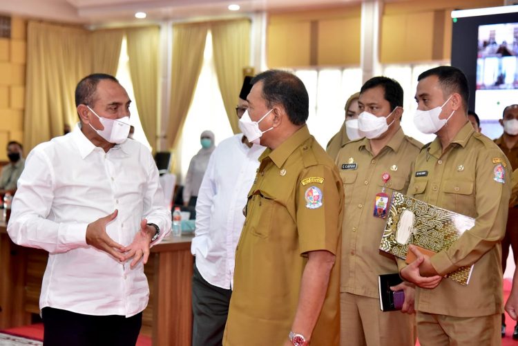 Ketika memimpin rapat koordinasi dalam rangka kesiapan Rumah Sakit di Sumut dalam lonjakan kasus Covid-19 dan evaluasi Pembelajaran Tatap Muka (PTM) di Sumut, di Aula Tengku Rizal Nurdin, Rumah Dinas Gubernur, Medan, Senin (7/2/2022).