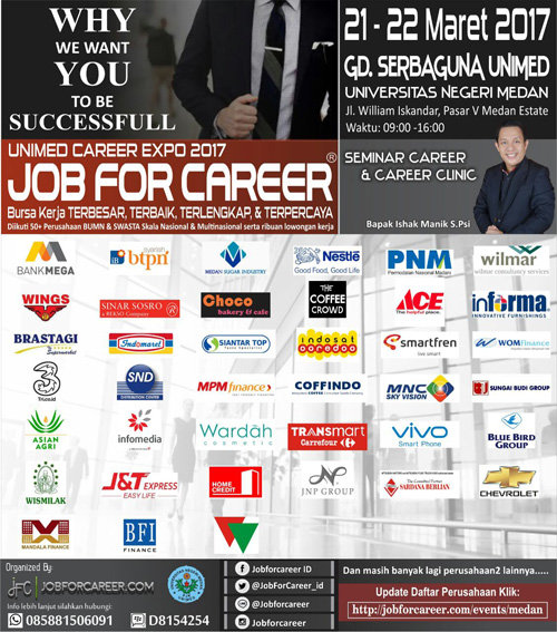 Ikuti UNIMED CAREER EXPO “JOB FOR CAREER” FESTIVAL 2017, Selasa & Rabu, 21 – 22 Maret 2017 di Gedung Serbaguna Universitas Negeri Medan, Jl William Iskandar, Pasar V Medan Estate dari pukul 09.00 – 16.00 WIB.