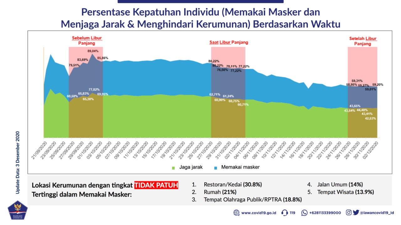 Tren penurunan tersebut terpantau terus berlanjut pada 27 November 2020. Dimana persentase kepatuhan untuk memakai masker ialah 58,32%. Sedangkan untuk menjaga jarak persentasenya ialah 43,46%. Dari data tersebut, dapat disimpulkan, bahwa liburan panjang merupakan momentum pemicu utama penurunan kepatuhan disiplin protokol kesehatan.