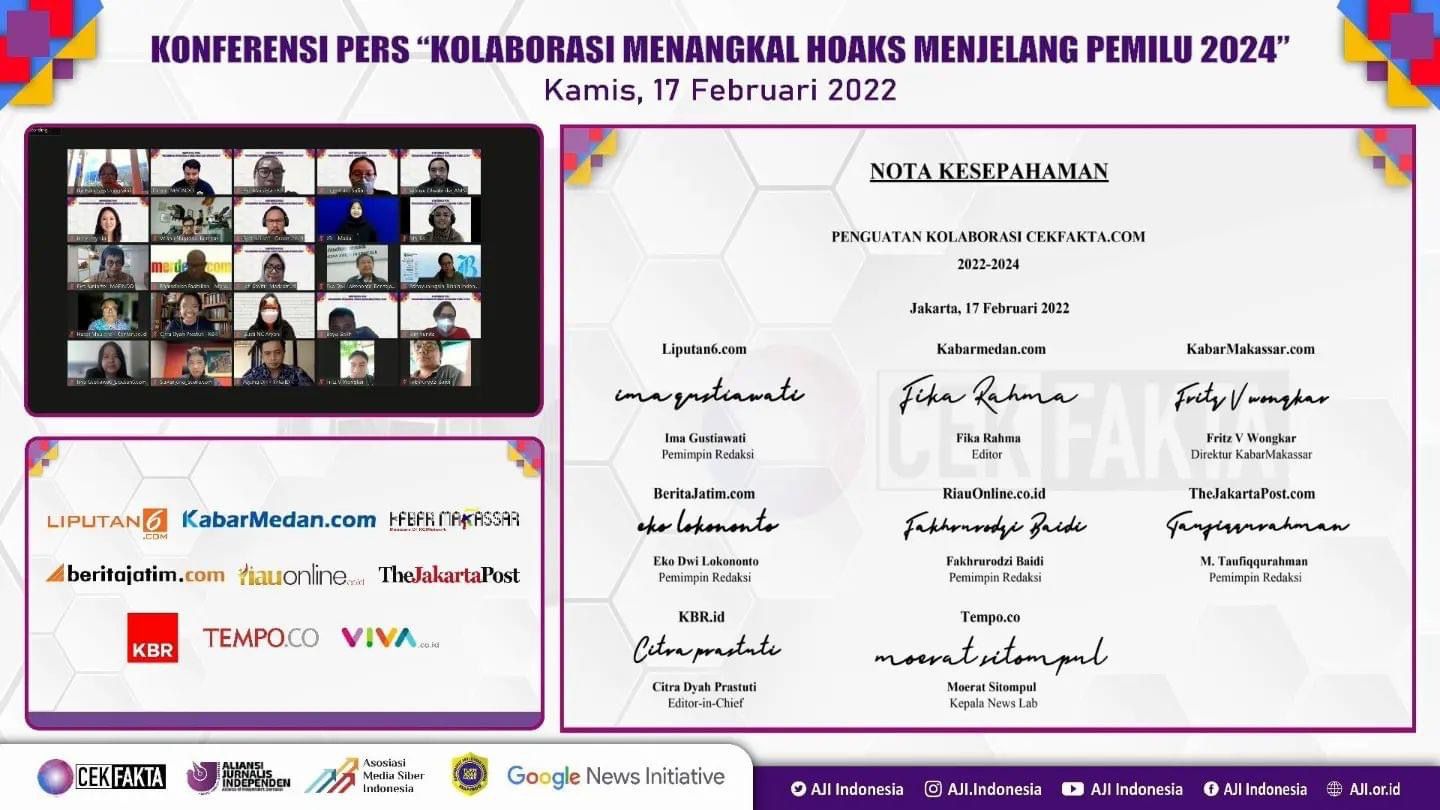 Komitmen memerangi informasi bohong itu ditandai dengan gelaran Diskusi Publik “Kolaborasi Menangkal Hoaks Menjelang Pemilu 2024” serta penandatanganan nota kesepahaman bersama anggota CekFakta.com secara daring pada Kamis 17 Februari 2022.