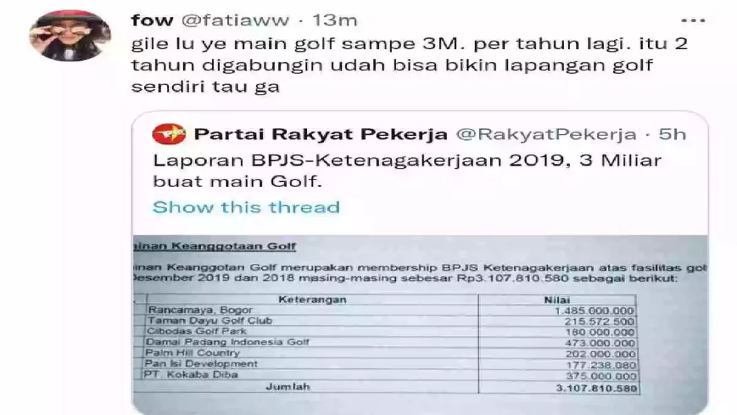 JAKARTA, KabarMedan.com | Polemik Jaminan Hari Tua (JHT) belum lagi selesai, beredar kutipan laporan keuangan BPJS Ketenagakerjaan yang diunggah ke Media Sosial Twitter oleh akun @RakyatPekerja “Laporan BPJS-Ketenagakerjaan 2019, 3 Miliar Buat Main Golf”.