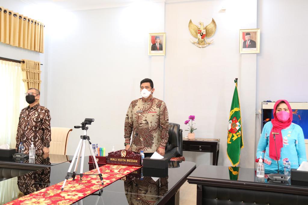 Walikota Medan, Bobby Nasution yang hadir dalam acara Penghargaan Kota Layak Anak Tahun 2021 secara virtual di Rumah Dinas Wali Kota Medan, Jl. Sudirman, Jumat (30/7/2021).