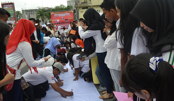 MEDAN, KabarMedan.com | Ratusan anak dan orang muda yang tergabung dalam program AKSI 2015 melakukan aksi long march dan panggung atraksi kreativitas “Orang Muda Berani Bicara” untuk pencegahan pernikahan anak, di Medan, Sabtu (19/12/2015).