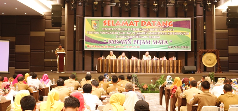 MEDAN, KabarMedan.com | Wakil Bupati Serdang Bedagai, Darma Wijaya membuka Sosialisasi Permendagri No.19 tahun 2018 tentang Peningkatan Kualitas Pelayanan Administrasi Kependudukan sekaligus meluncurkan inovasi Paket Layanan Pelayanan Satu Jam Mantap Tanpa Pungutan Apa-apa (Pak Yan Pejam Mata),Selasa (15/5/2018) di Ballroom Sudirman Hotel le Polonia Medan.