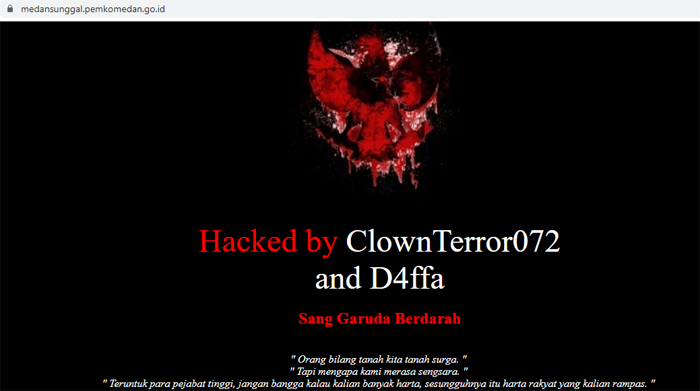 Saat di akses situs tersebut menampilkan sebuah tulisan Hacked by Clown Terror 072 and D4ffa, Sang Garuda Berdarah.