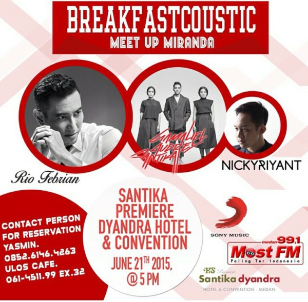 “Untuk bisa menikmati penampilan dari kedua artis tersebut, tamu dapat membeli voucher paket berbuka puasa hanya seharga Rp 170,000 net/orang, sudah bisa menikmati sajian khas Santika Medan diiringi alunan musik akustik artis idola dan mendapatkan CD terbaru mereka,” kata Gledy.